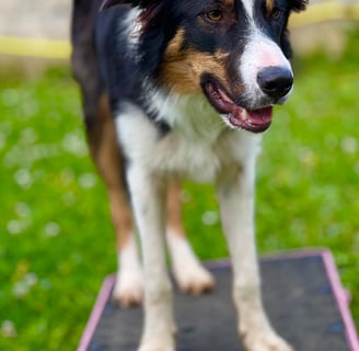 J’avoue que mes années d’expériences (et ma passion pour les tricks, c’est vrai j’adore cela !), fait que ce n’est pas un problème pour moi. Je vais pouvoir apprendre les compétences minimales pour que Volt commence les « brevets » de Dog Dancing, Obéissance/Obedience ou encore Hoopers entre autres. Je l’ai déjà fait avec d’autres chiens, et je vais retrouver le chemin, pour pouvoir le faire avec lui. Nous avons commencé, c’est en bonne voie pour le Dog Dancing et pour l’obéissance nous mettons en place un élément important, la stabilité physique. Mais surtout nous apprenons à communiquer et à « travailler », à utiliser les objets de motivation et l’interaction entre nous deux, à savoir se poser quand les autres travaillent et être calme dans certaines circonstances, à savoir utiliser des cibles et du targeting, les manipulations (en vue du medical training), et bien sûr les tricks! Et déjà c’est tout un programme ! Un pas à la fois, l'essentiel est de construire apprentissage après apprentissage cette fameuse relation ensemble.