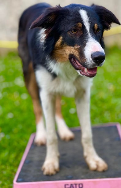 Ce n’est pas le premier chien avec lequel je souhaite pratiquer un sport canin : c’est le 10ème avec lequel je travaille pour cela. 10 chiens, cela commence à compter et pourtant … il est tellement différent de tous ceux que j’ai eu. J’ai l’impression que j’aime collectionner les défis dans ma vie ! Car à chaque chien de nouveaux défis, et de nouvelles pistes de travail ! Pour Volt, nous allons explorer le thème de la proprioception/fitness pour lui apprendre à gérer ses longues pattes de girafe, et surtout ses pattes, arrière qui pour l’instant ont une vie un peu indépendante du reste du corps.
